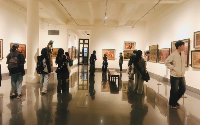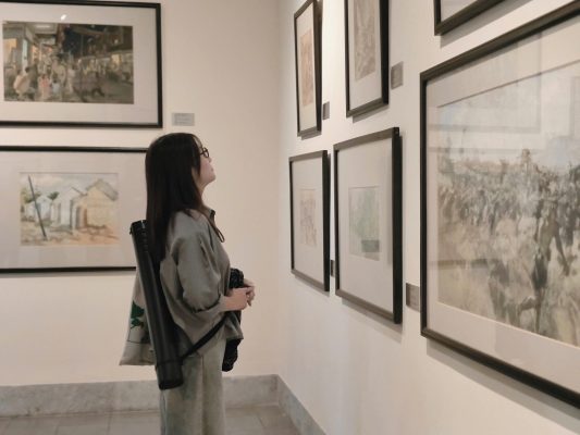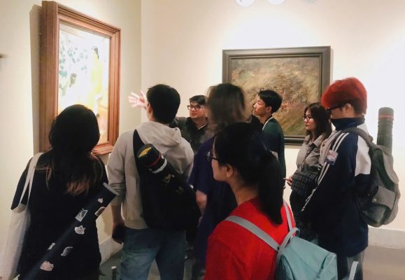 Trong không gian tràn ngập sắc màu và chất liệu tại Bảo tàng Mỹ thuật Việt Nam.Trong không gian tràn ngập sắc màu và chất liệu, thầy Trịnh Tùng đã giới thiệu cho sinh viên về các thể loại tranh, kỹ thuật tạo hình, chất liệu cùng cách phối cảnh không gian trong tranh – nội dung được ứng dụng trực tiếp từ bộ môn Luật Xa Gần mà các em vừa được học trên lớp.