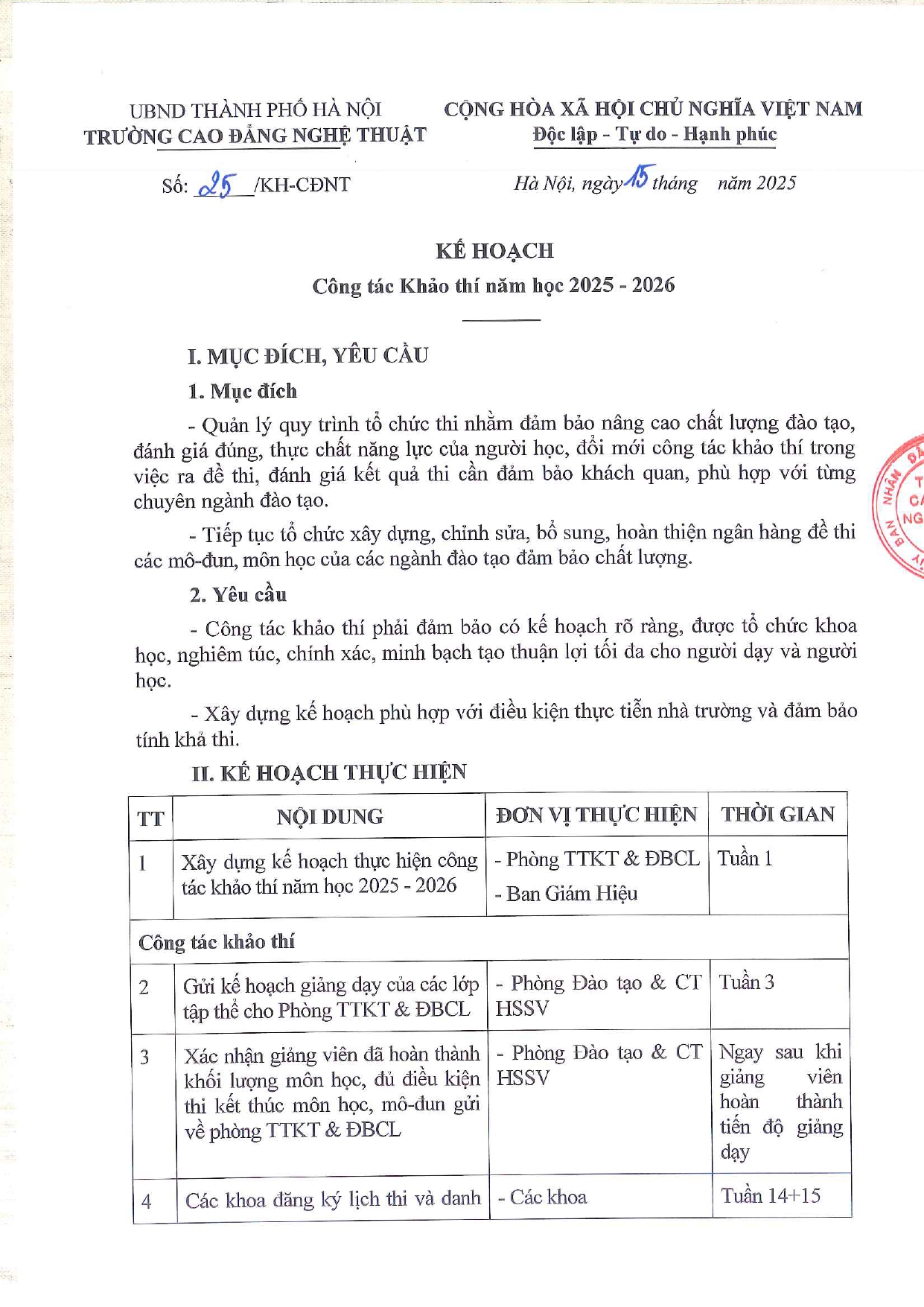 Kế hoạch Công tác khảo thí năm học 2025 – 2026