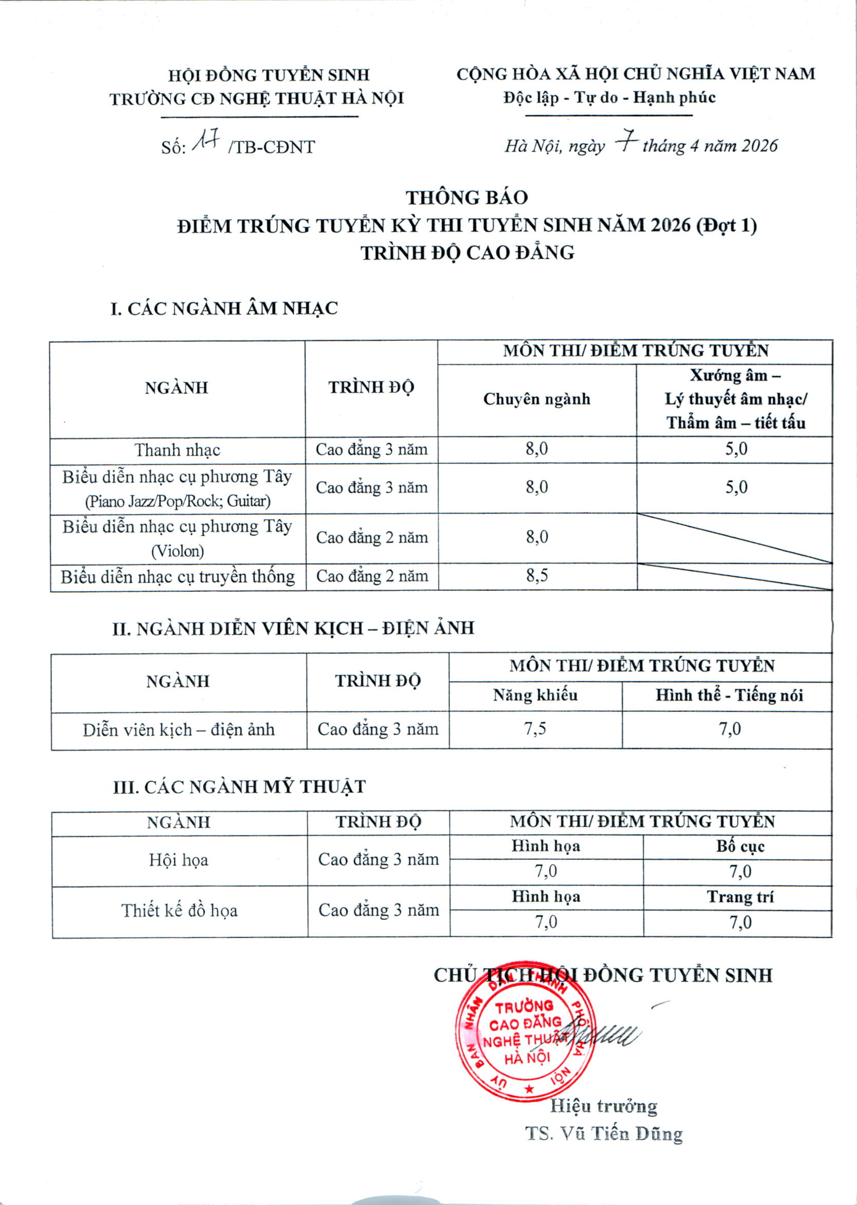 ĐIỂM TRÚNG TUYỂN KỲ THI TUYỂN SINH NĂM 2026 (Đợt 1) – TRÌNH ĐỘ CAO ĐẮNG