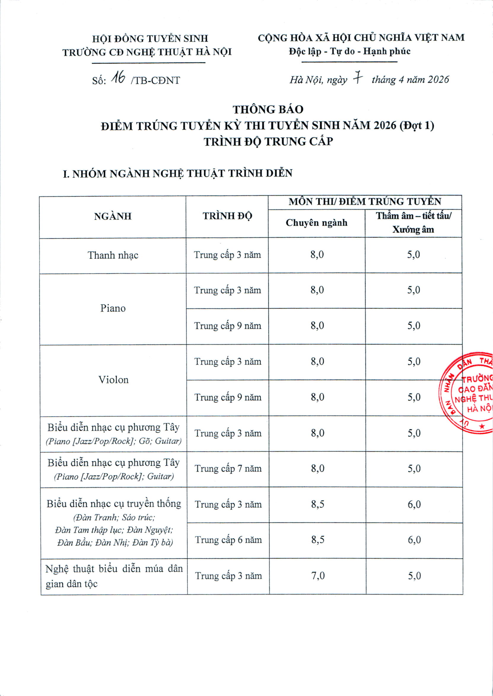 ĐIỂM TRÚNG TUYỂN KỲ THI TUYỂN SINH NĂM 2026 (Đợt 1) – TRÌNH ĐỘ TRUNG CẤP
