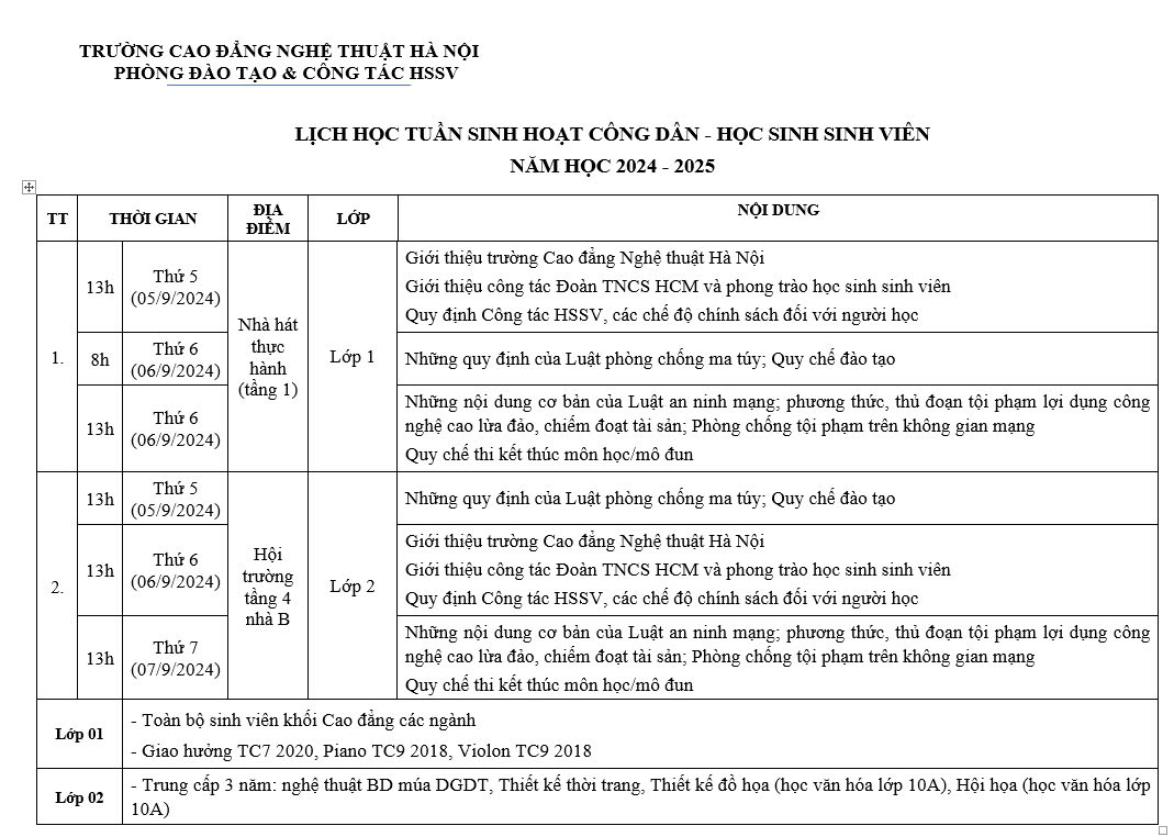 Lịch học tuần sinh hoạt công dân – HSSV năm học 2024-2025
