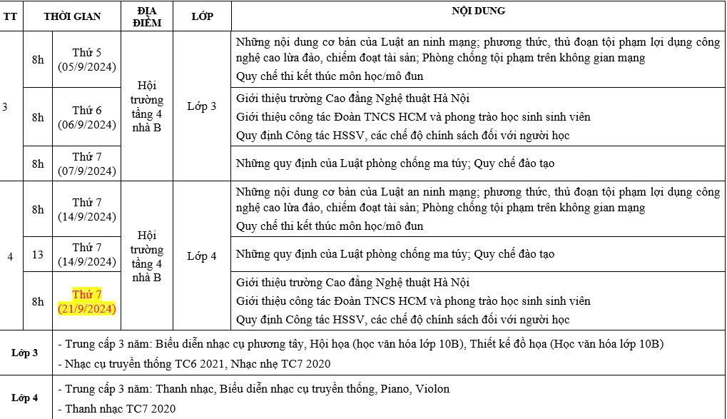 Lịch học tuần sinh hoạt công dân – HSSV năm học 2024-2025