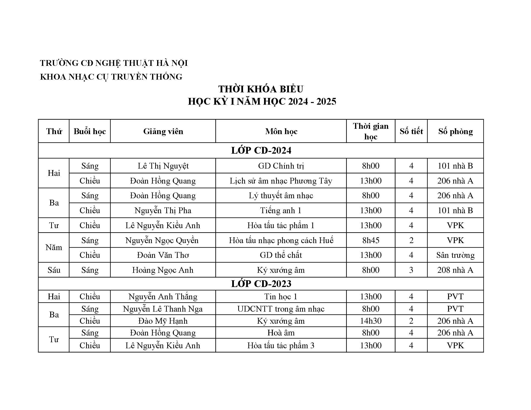 Thời khóa biểu Khoa Nhạc cụ truyền thống HKI năm học 2024 – 2025 Đăng vào 09/09/202409/09/2024 bởi TrangPH DT TKB HKI Mon chung 2024 Khoa NCTT 00001 DT TKB HKI Mon chung 2024 Khoa NCTT 00002 DT TKB HKI Mon chung 2024 Khoa NCTT 00003 DT TKB HKI Mon chung 2024 Khoa NCTT 00004