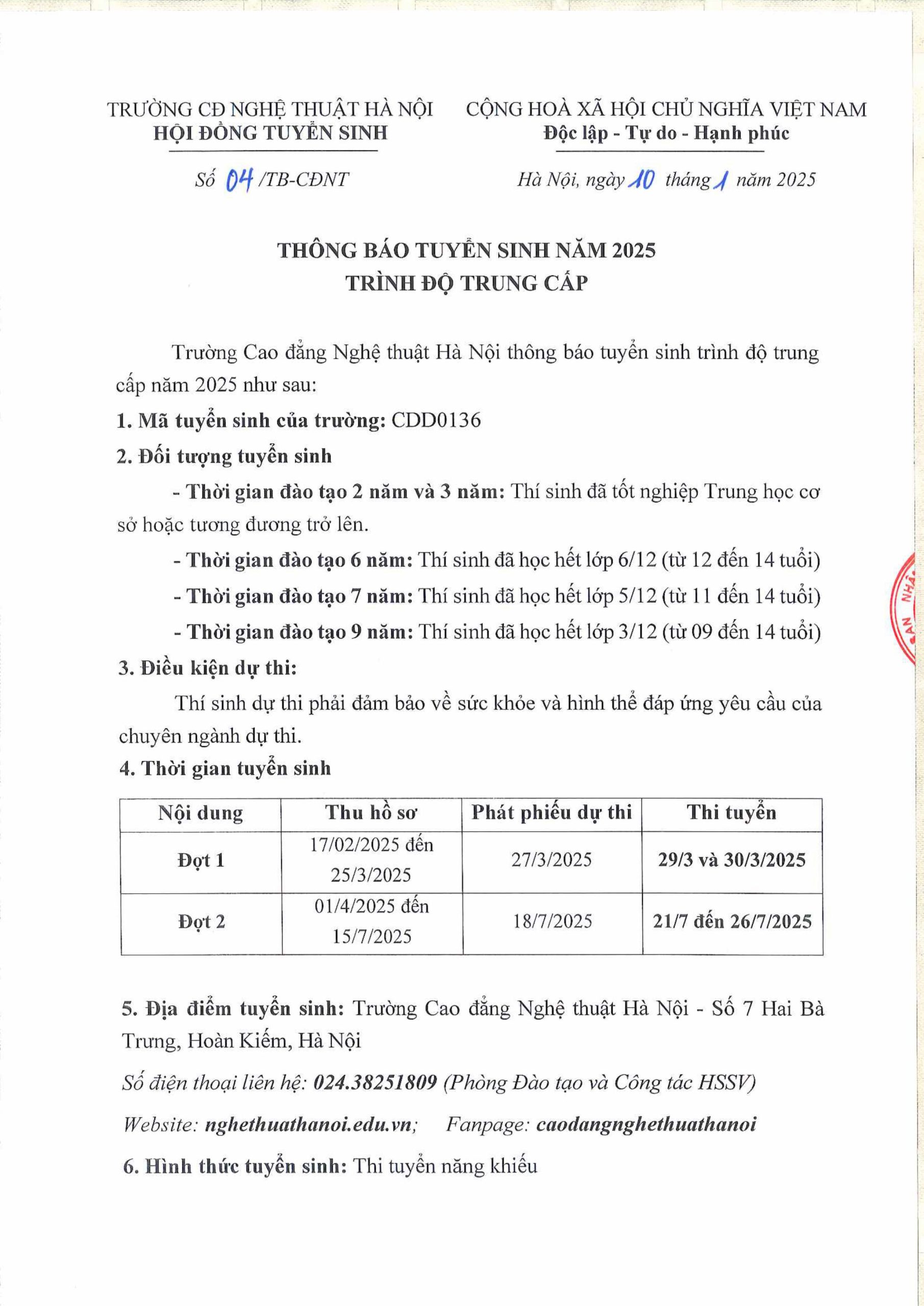 Trường Cao đẳng Nghệ thuật Hà Nội chính thức thông báo tuyển sinh trình độ Trung cấp năm 2025.